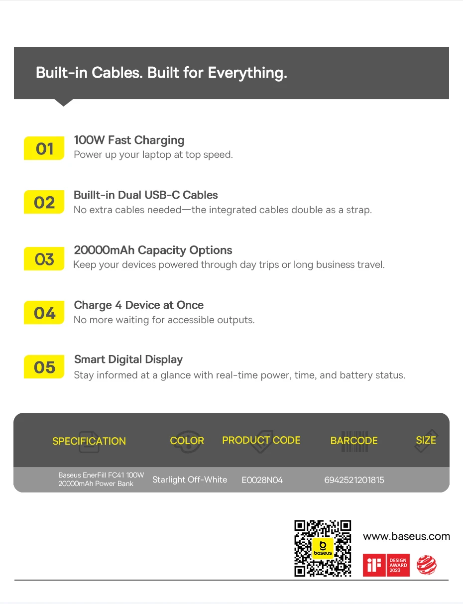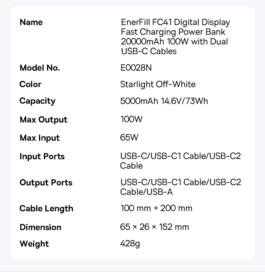 1. Name: EnerFill FC41 Digital Display Fast Charging Power Bank 20000mAh 100W with Dual USB-C Cables