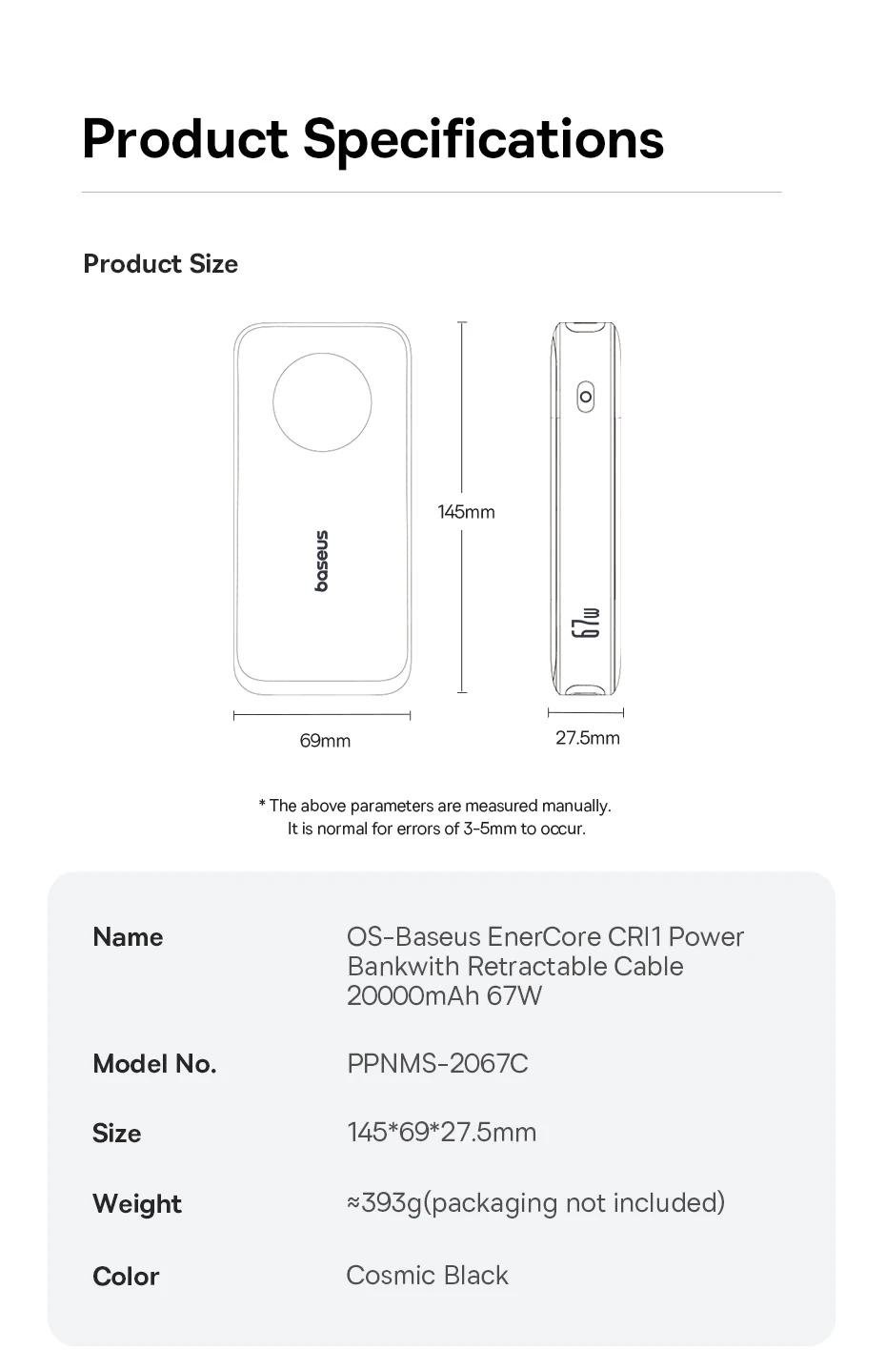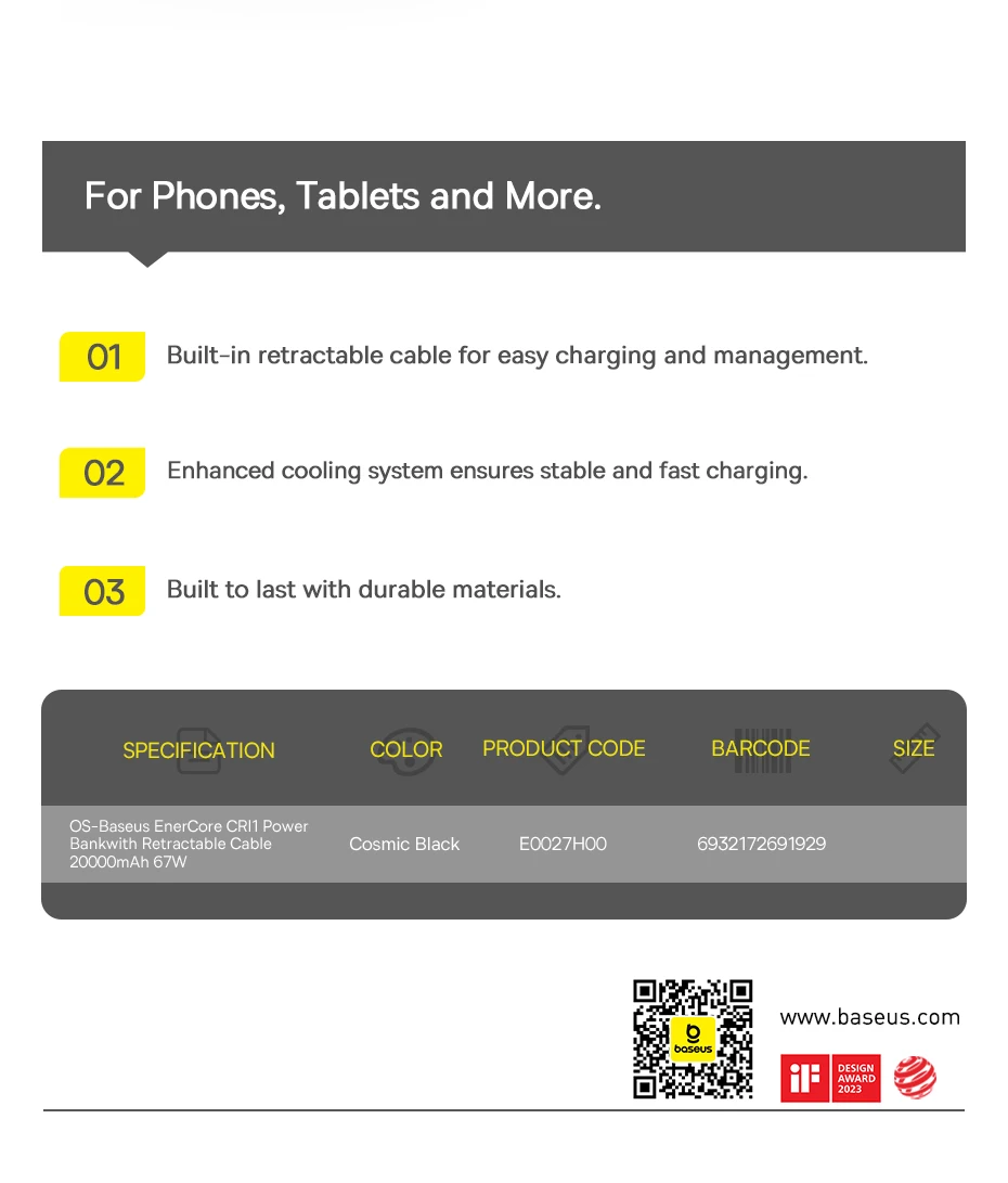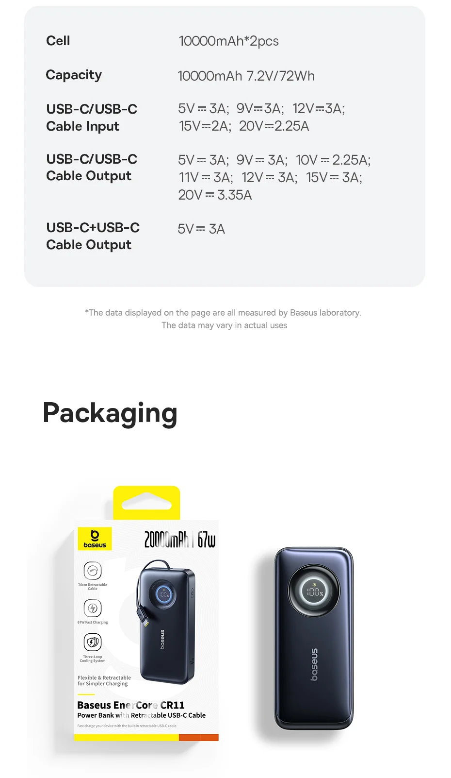 1. Name: OS-Baseus EnerCore CR11 Power Bank with Retractable Cable 20000mAh 67W
