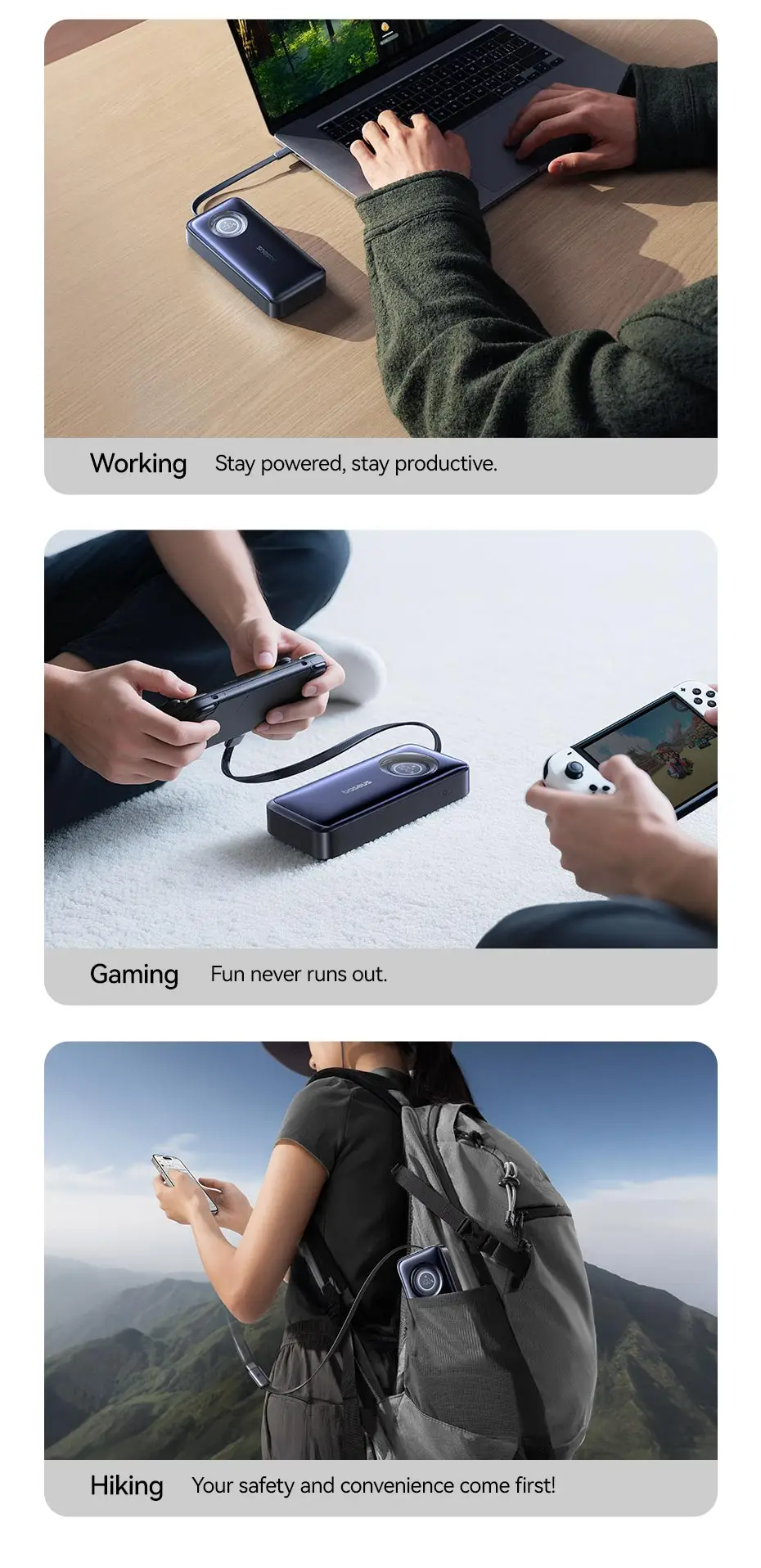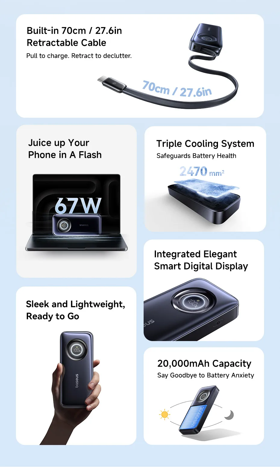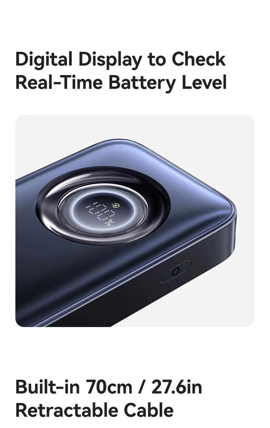 1. Built-in 70cm/27.6 inch retractable cable, pull to charge, retract to declutter.