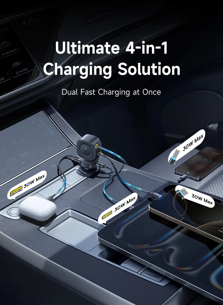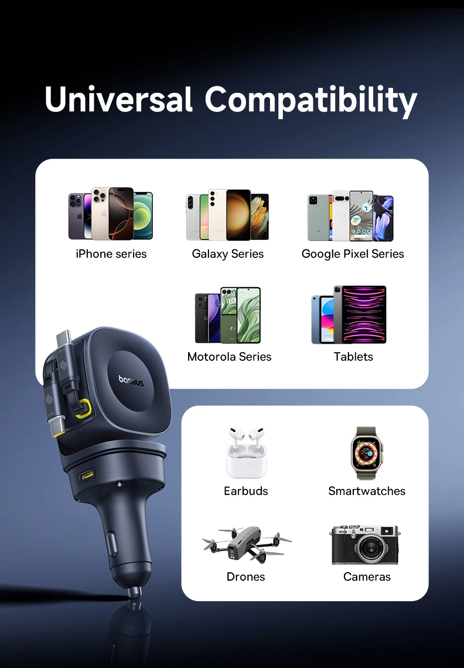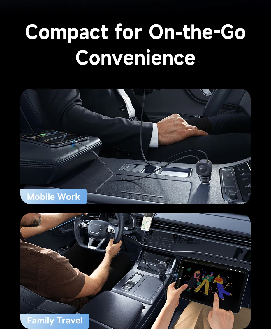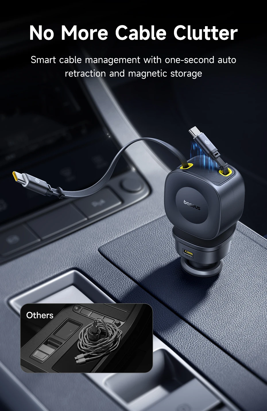 Baseus 60W Car Charger 2 in 1 Retractable Cable SCP 25W QC PD 30W Fast Car Phone Charger For iPad iPhone 16 15 14 13 Pro Samsung